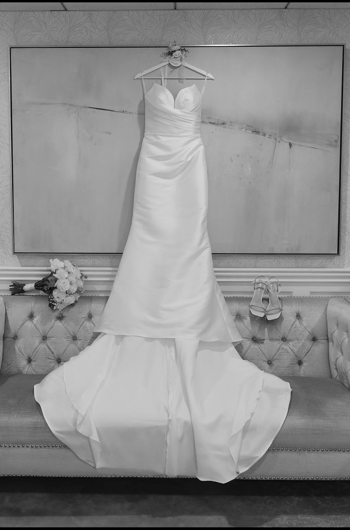 A wedding dress hanging on a white hanger with a floral decoration on a patterned wallpapered wall. A bouquet of flowers and a pair of high-heeled shoes are placed on a velvet tufted sofa beneath the dress. Marilyn by Etoile by Elysee