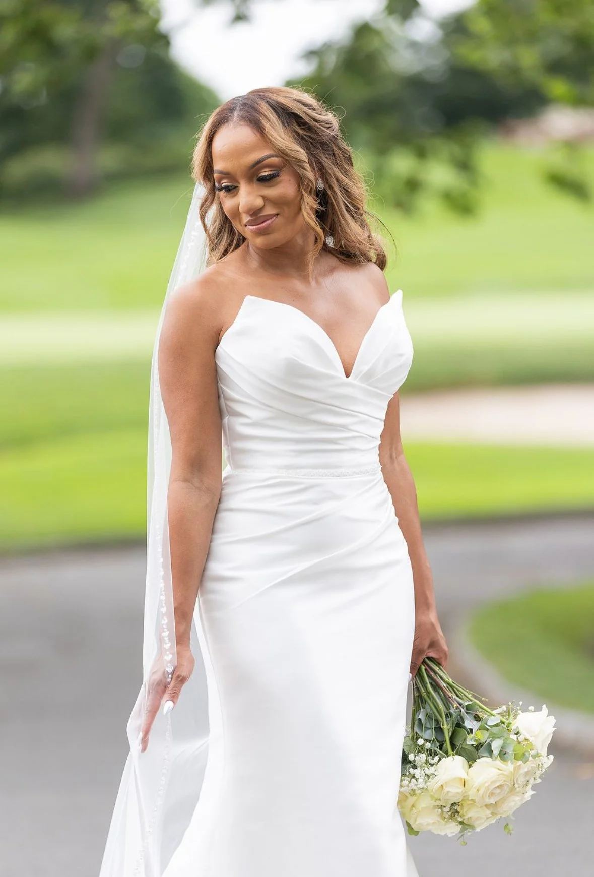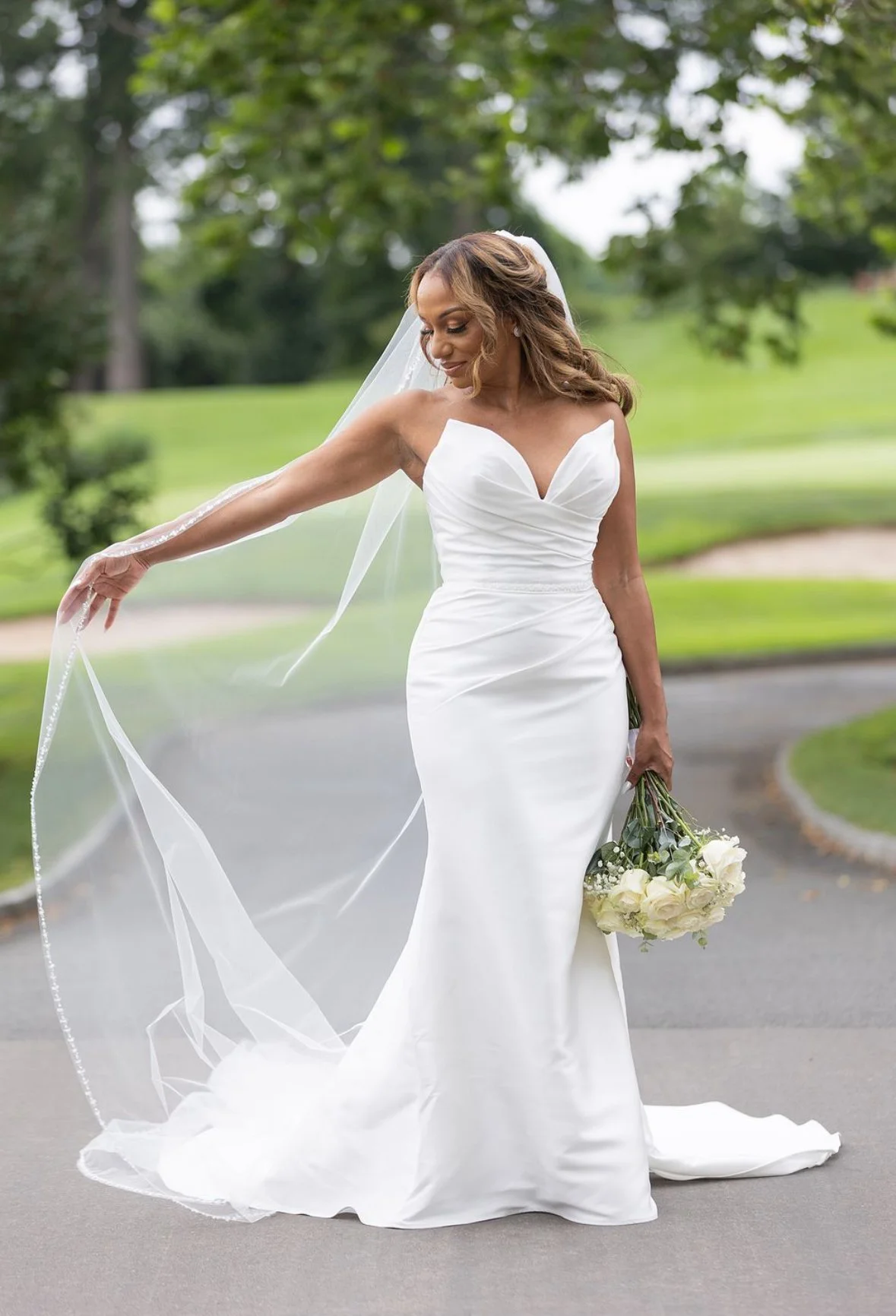 A bride in a strapless white wedding gown holding a bouquet of white roses outdoors on a green and blurred background. Marilyn by Etoile by Elysee