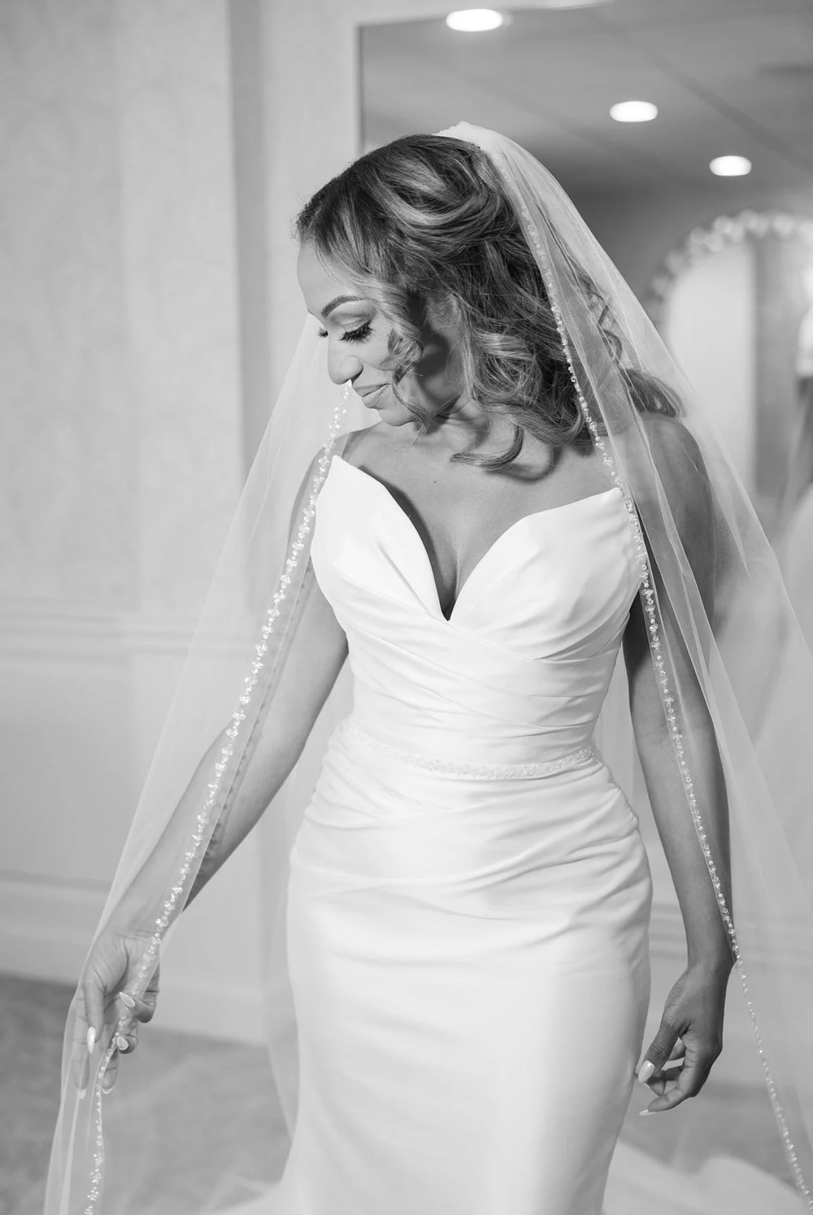 A bride in a white wedding gown with a veil, looking down and smiling softly, standing indoors. Marilyn by Etoile by Elysee